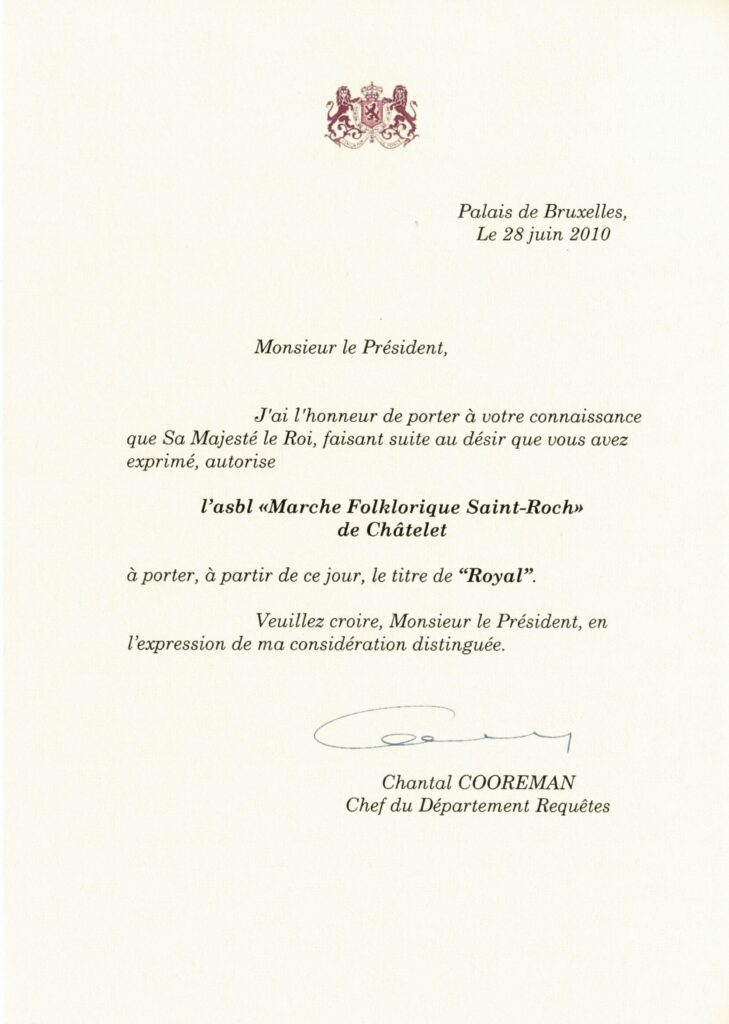 Mons, 1er juillet 2010 – Reconnaissance Royale : René Gheys, Alex Dupanloup, Emile Louche, Jean-Marc Mauïen, Daniel Vanderlick (Bourgmestre), André Sainthuile (Président), Claude Durieux (Gouverneur), Henri Baumal, Yves Sellier, Roland Lambiliotte, Michel Lambot (Echevin du Folklore)